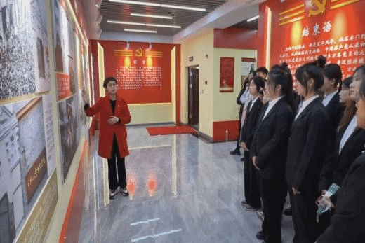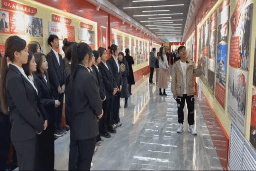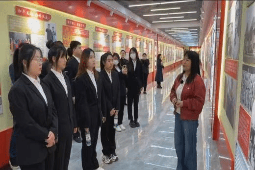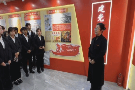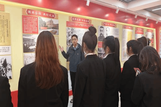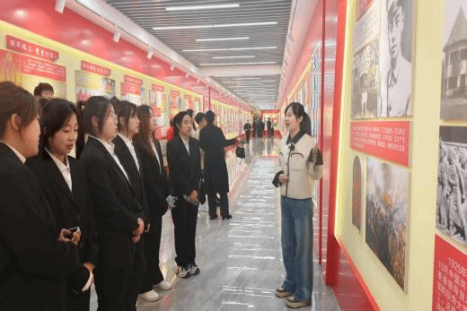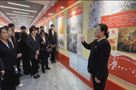 随后,马克思主义学院教师团队在党史文化长廊为学生同上一堂行走的思政课。从开天辟地的大事变——中国共产党的诞生讲起,沿着党的百年奋斗历程,以伟大事件和中国精神为主线,教师们生动地向学生展示了中国共产党为争取民族独立、人民解放和实现国家富强、人民幸福所做的努力,让学生接受了一次别开生面的红色精神的洗礼。