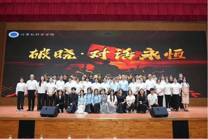 《破晓・对话永恒》是计算机科学学院师生历时两个月精心创作的红色主题舞台剧,该剧以中国共产党建党前后的历史进程为脉络,选取李大钊、王会悟、蔡元培、陈延年、陈乔年等革命先驱作为核心人物,通过“时空对话”这一创新形式,串联起关键历史场景。全剧以当代青年学生的“寻光”之旅为线索,借由与百年前先辈的跨时空对话,展现了革命先辈以思想觉醒引领民族觉醒的壮丽篇章,深刻诠释了“信仰传承”与“时代担当”的精神内涵。