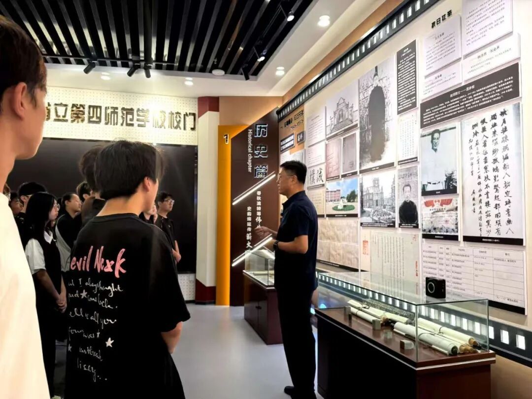 进入校史馆,陈建军驻足于学校百年发展展区,从1914年奉天省立第四师范学校讲起,重点回顾“九一八”事变后,学校师生在办学条件极端艰苦的情况下,仍坚持教学、投身救亡图存运动的红色历程。他强调,这段校史是伟大抗战精神的生动体现,更是学校“以史育人、以文化人”的宝贵资源,鼓励青年学子从历史中汲取奋进力量,将爱国情、强国志转化为报国行。