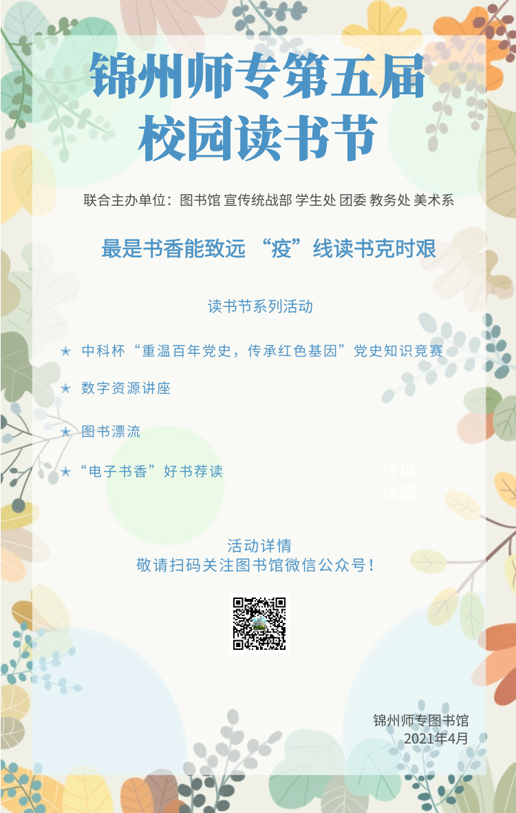 2021年4月23日,锦州师专图书馆第五届校园读书节系列活动正式启动。本次活动作为第五届读书节系列活动,得到了学校领导的大力支持和全校师生的积极参与。