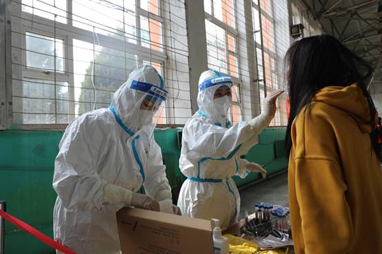 全员核酸检测,为师生健康保驾护航。保障核酸检测顺利进行,也是后勤人的一项重要任务。后勤人员每天一次核酸检测,在校师生根据不同比例每天循环抽检,这一切的背后离不开后勤人的努力和付出。校医务所和相关服务保障人员化身“大白”,每次核酸检测开始前,都早早到达,维持秩序、引导排队、清点人数、协助扫码……防护服外是春寒料峭,防护服内的他们早已汗流浃背。“经常一站就是一整天,还要不停地做协调沟通,嗓子哑了也要继续说。但是想到全校师生对于我们的信任和支持,再苦再累也值得了。”