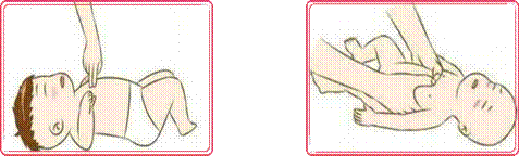 如果异物未咯出,则需将婴儿翻身,仍是头稍下倾,置于前臂上。用手托住婴儿后脑,另一只手伸出食中二指,迅速用力按压婴儿胸骨中间,反复五次。观察异物是否咯出。
