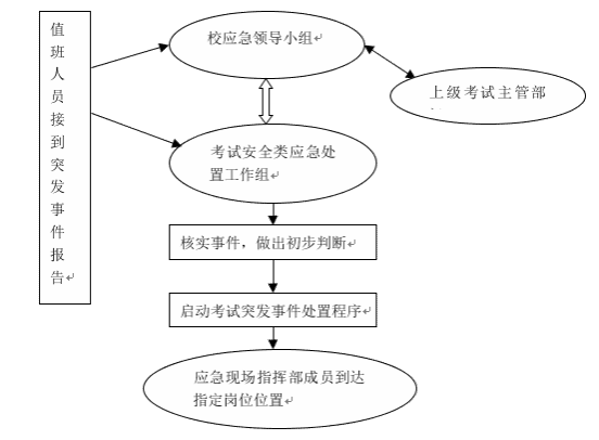 在预测将要发生和已经发生考试安全类突发事件时,在应急处置工作组在架构的基础上,根据突发事件的严重程度以及涉及的部门和单位情况,成立由主要校领导或分管校领导、相关部门和单位负责人组成的应急现场指挥部。