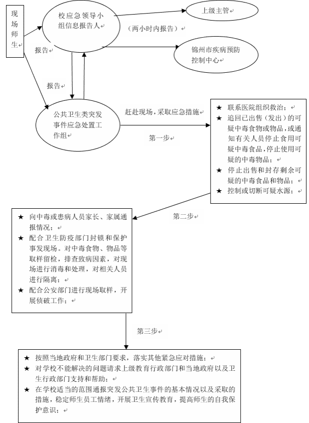 (2)统一指挥,快速反应。学校成立校园安全突发公共事件应急处置工作领导小组全面负责应急处置工作,建立健全处置校园安全突发公共事件的快速反应机制,确保发现、报告、指挥、处置等环节的紧密衔接,做到快速反应,正确应付,处置果断,力争问题解决在萌芽状态。