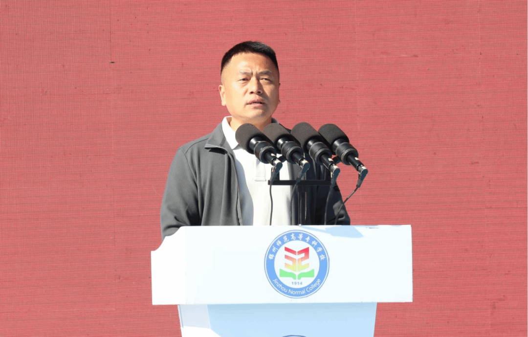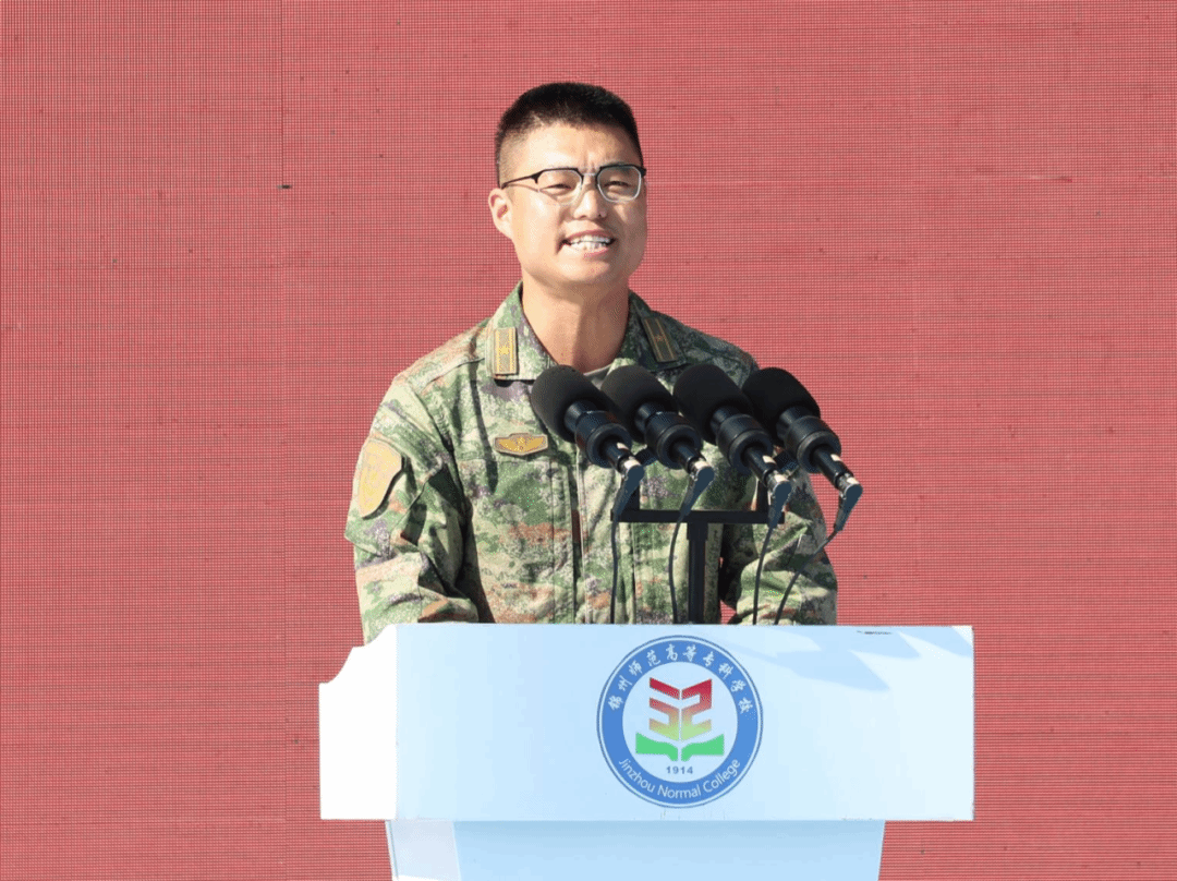 陈建军代表学校致辞。他代表全校师生向3964名新同学的到来表示热烈欢迎,向承训本次军训的部队领导和教官表达最诚挚的欢迎与感谢。他指出,我校是一所历史悠久、底蕴深厚、人才辈出、教学质量突出的百年名校,在党政军领导干部、学界翘楚、艺术名家中不乏锦州师专优秀学子的身影,目前学校正全面推进“新双高”建设,加快推进升格本科层次职业技术师范大学的各项工作,奋力向建设“省内一流、全国知名”的高水平院校阔步前进。